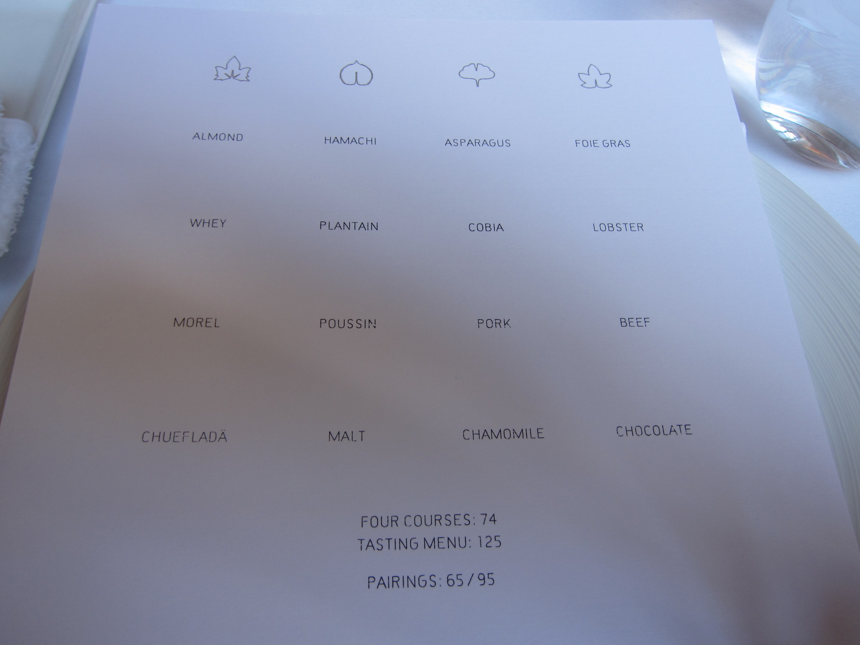 The 4 course pre fixe concept is: a simple matrix menu. There are 4 rows and 4 columns of single ingredients. The first row is appetizers, the second fish/seafood, the third meat, the fourth dessert. You choose one ingredient from each row, this would be the main ingredient of your dish, and leave the rest to the chef to “surprise you.” The very friendly and professional staff ask if you have any allergies or any special dietary needs or if you’d prefer a certain appetizer hot or cold and were very knowledgable about each ingredient and were smart to give you just enough information so that you know sort of what you are ordering but leave enough that you can still be surprised by what ends up in front of you.