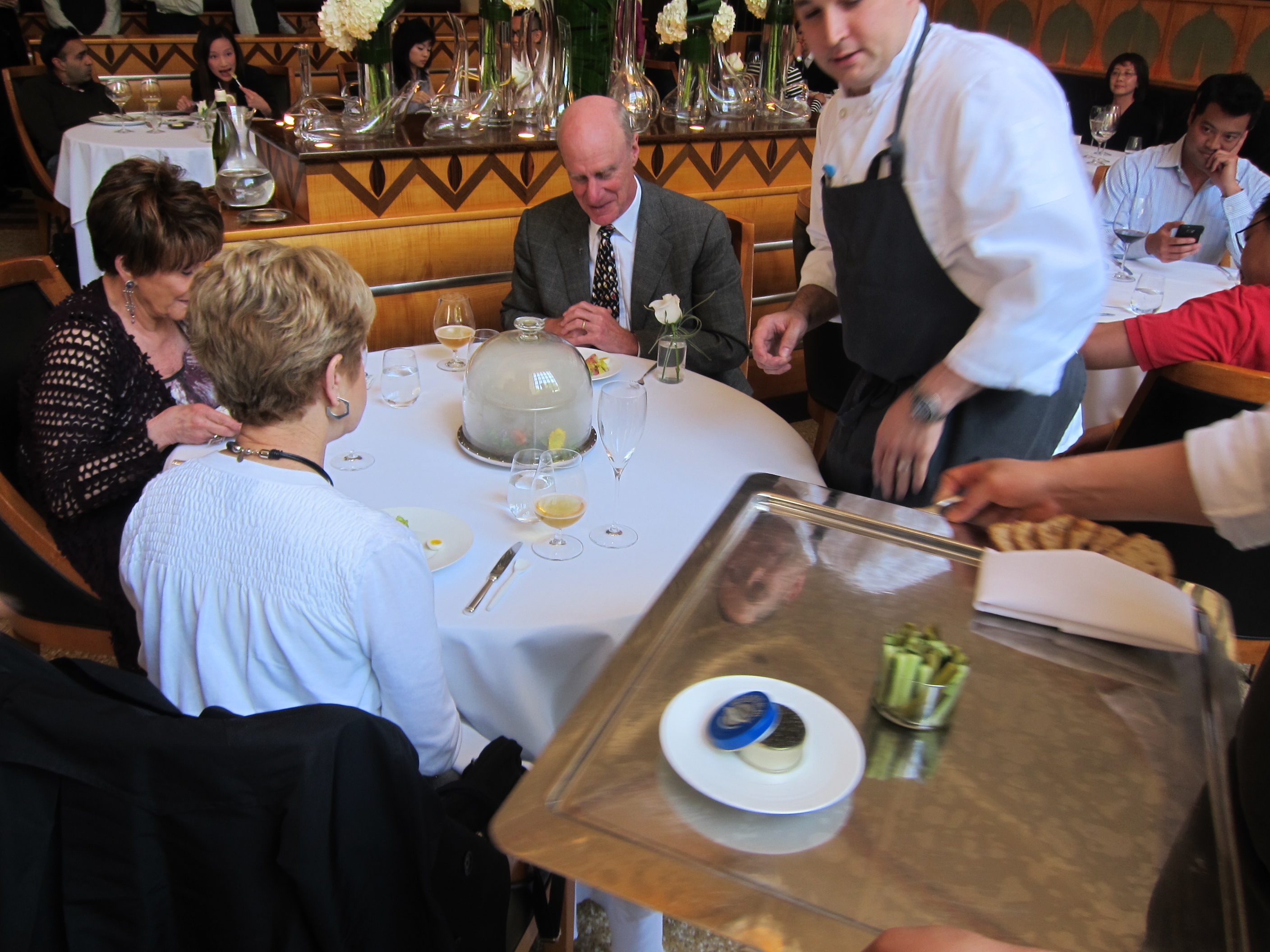 We were surrounded by foodies like ourselves at lunch. Between each dish we had conversations with our neighbors about what was good and what other New York establishments we have had and recommend. From the top such as Per Se, Le Bernardin and Blue Hill at Stone Barn, to the lower priced places such as the Modern bar room, and Parm. A table behind us ordered an item that was not part of any menu at the restaurant but was something that could be requested. It looked like some botanical garden. A class dome enclosing what looked like flowers in a smoke coming from dry ice. The diners invited us over to look in wonder with them and also said we could take as many photos as we wanted. When the dome was lifted it revealed flowers on the bottom and toast, the waiters then brought along caviar. This was to create a way to eat the caviar. How I wished to try that caviar.