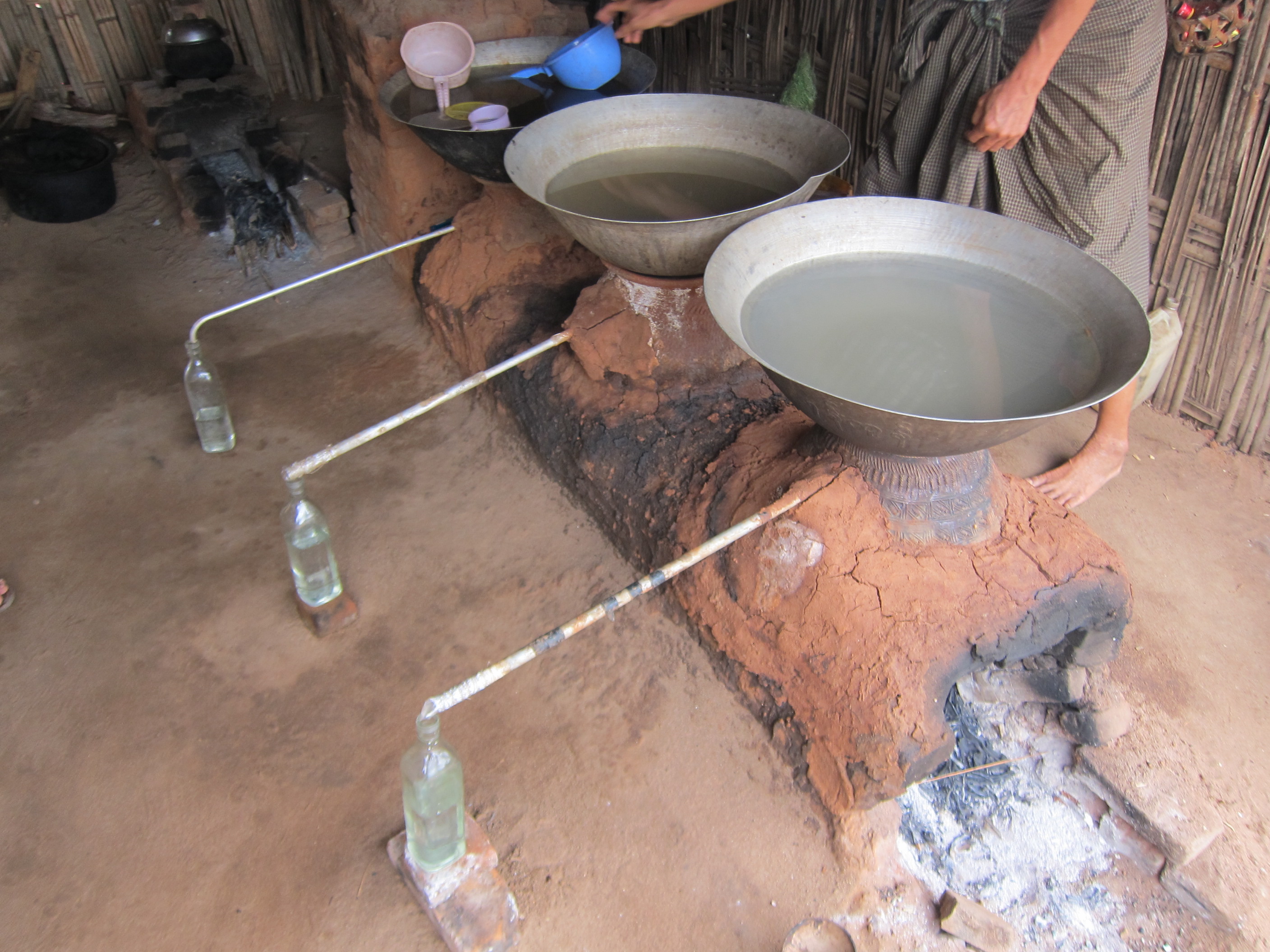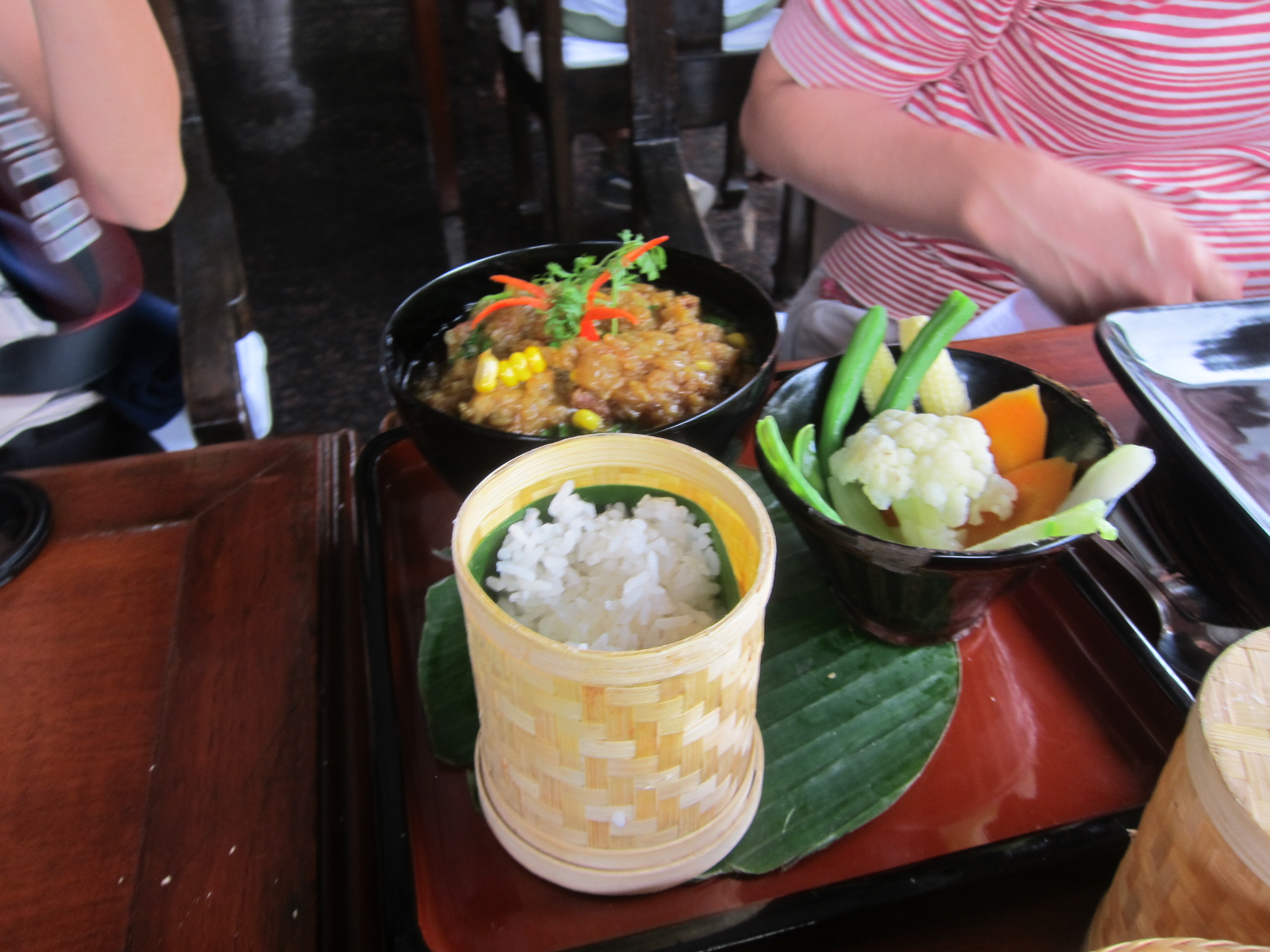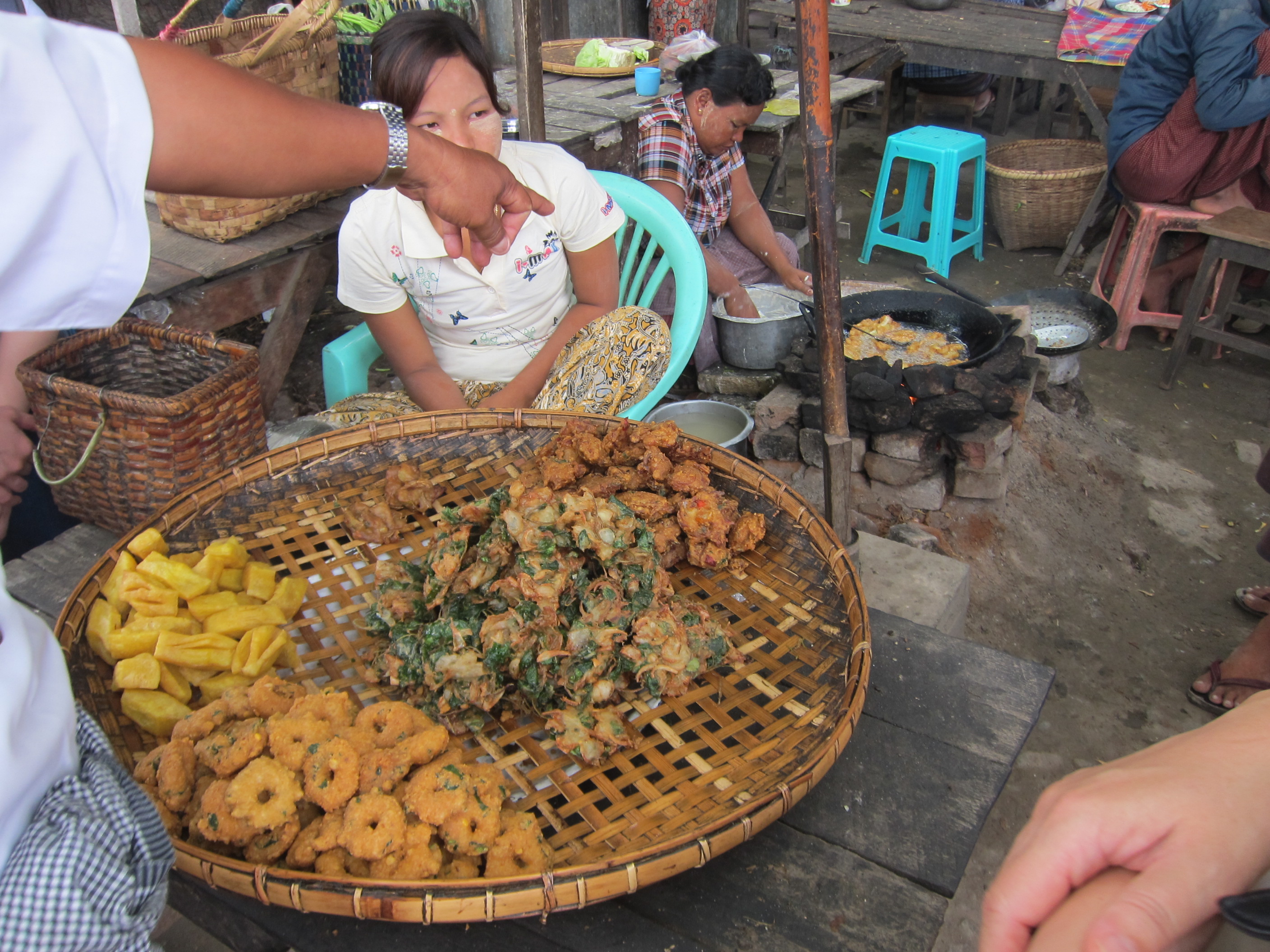 On the journey back we visited a palm sugar plantation, where we saw how peanut and sesame oil is made, how one climbs up the palm tree to bring down the palm sugar, how palm sugar is boiled, how it can also be used to produce liquor such as palm sugar rum. Here we also had a try at palm sugar dessert, where you take a small ball of palm sugar and a handfull of roasted sesame and pop it into your mouth, delicious. We also had a small traditional Burmese snack and tea. The snack came from a round utensil where you scooped whatever you wanted into your palm and ate it, there was fried sesame, garlic, peanuts, tea paste, and various beans.