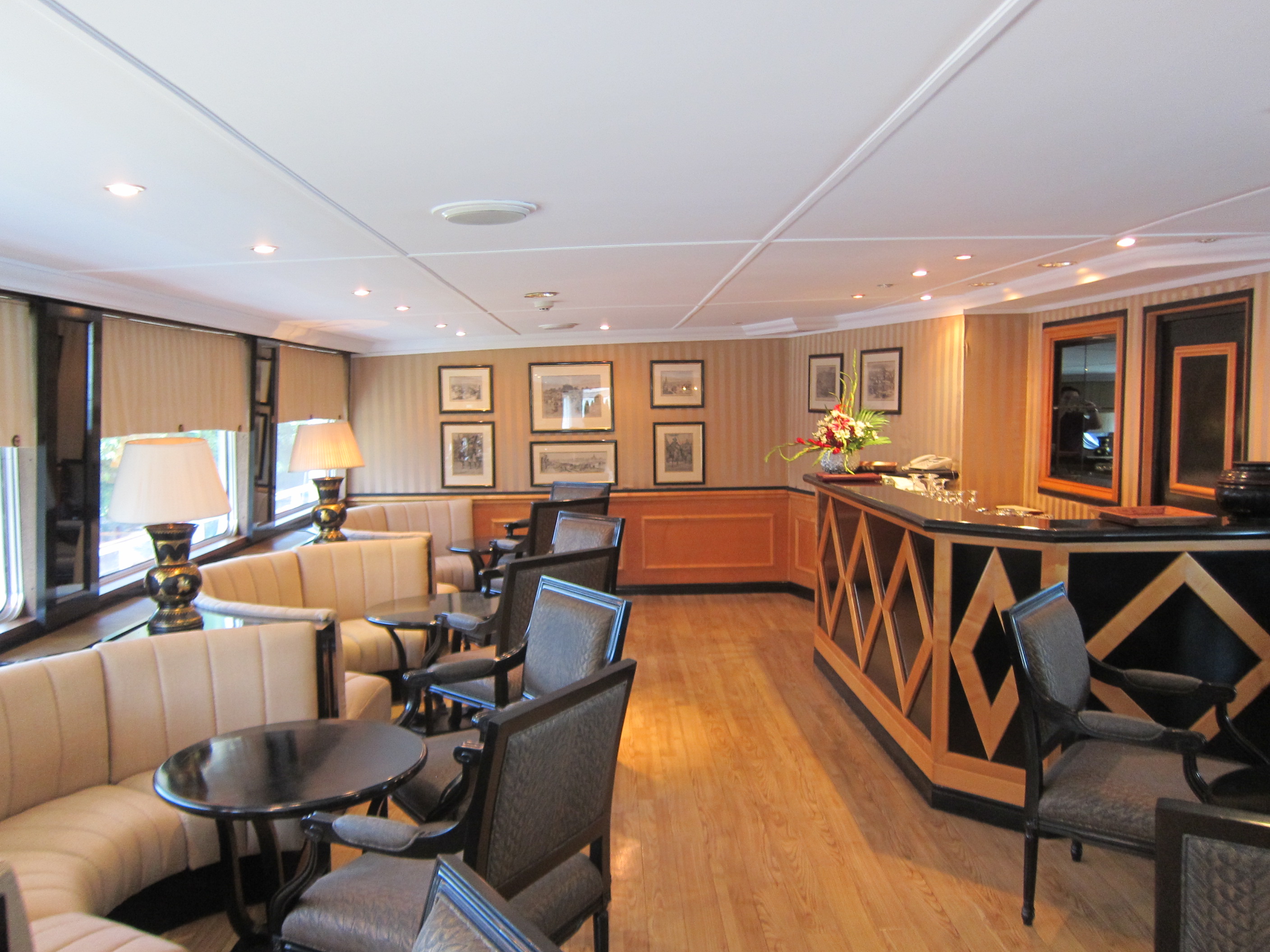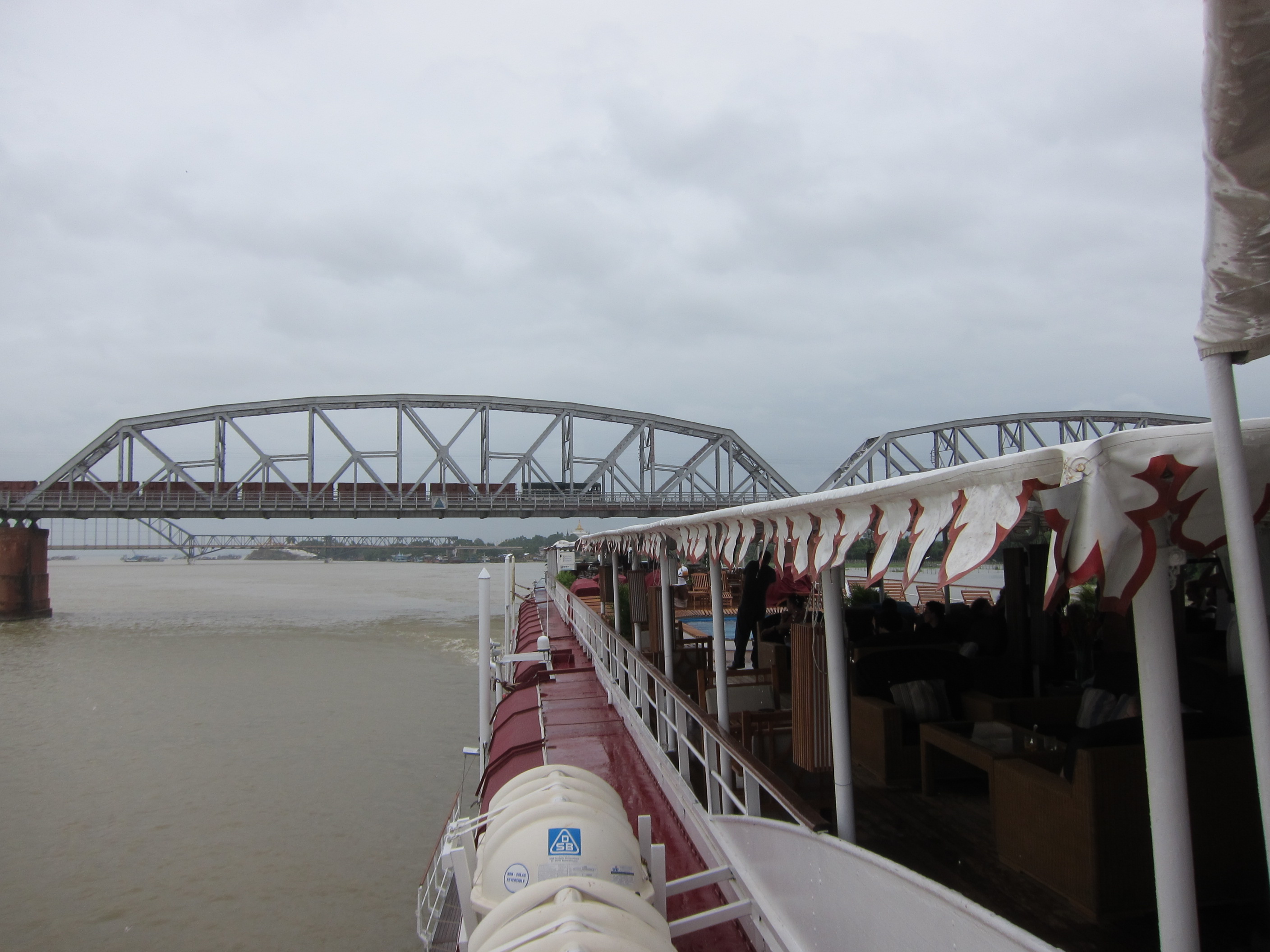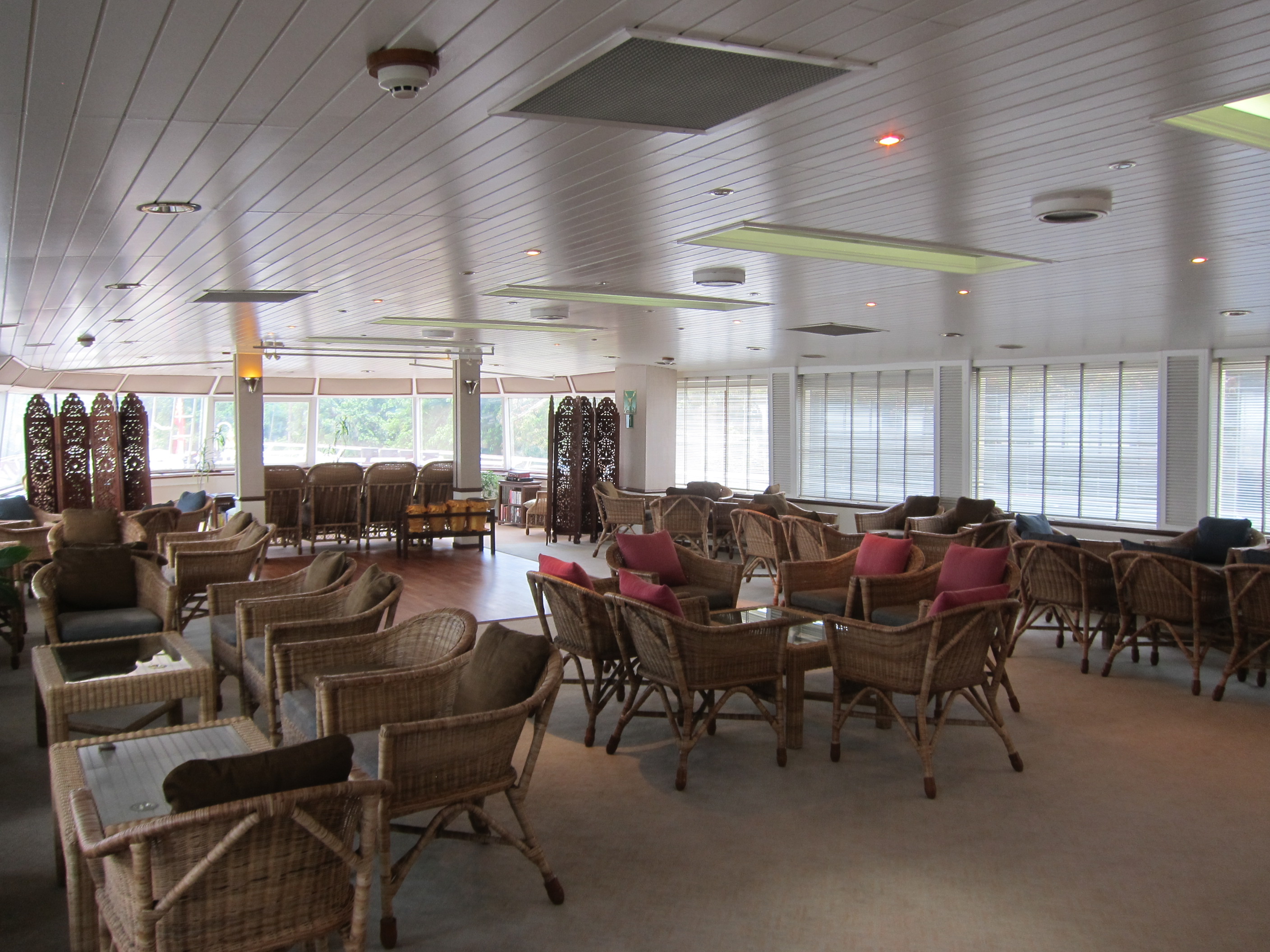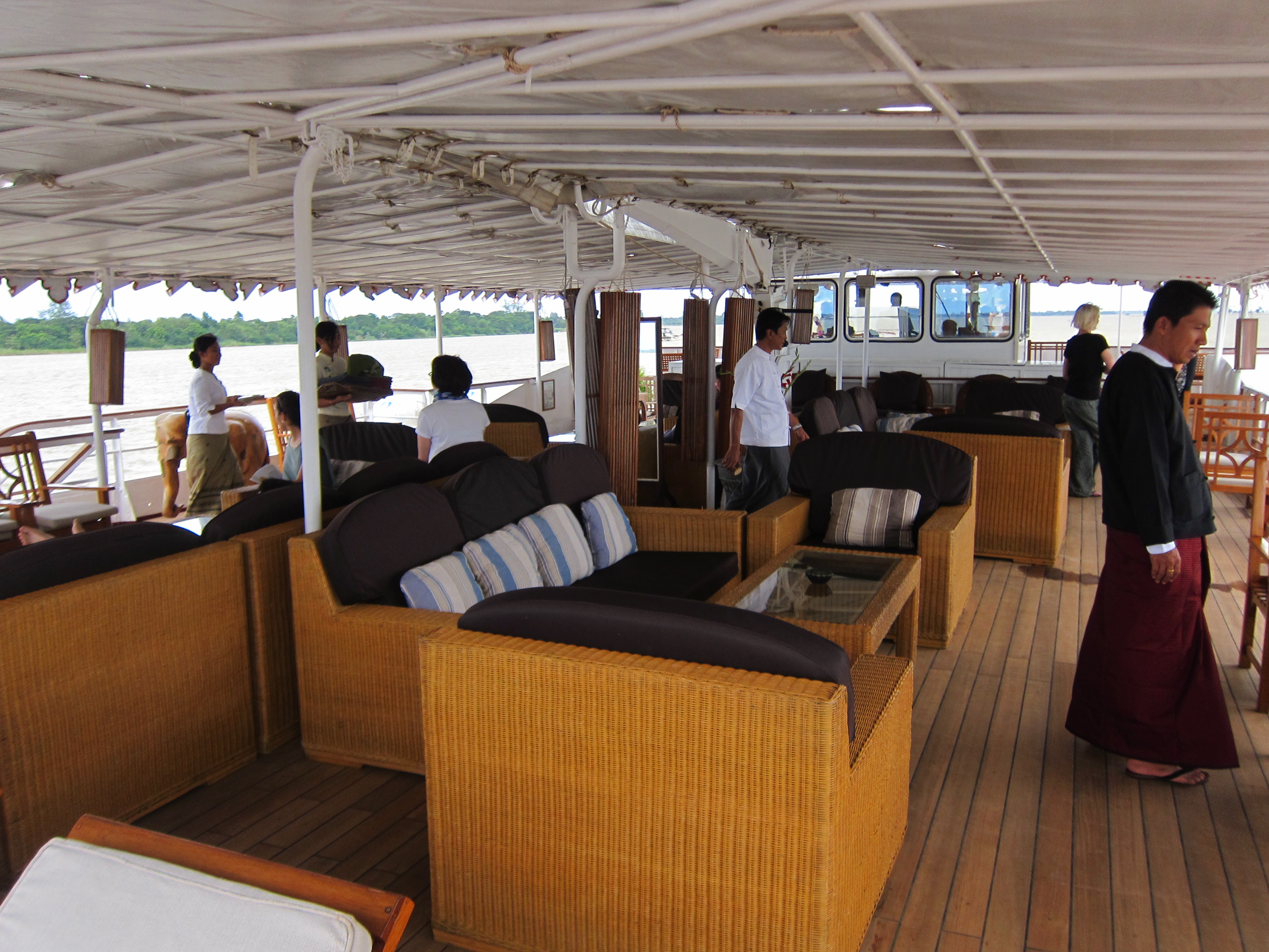 Finally after a morning of touring, and an incredible sight at the monastery we arrived at the dock to board The Road to Mandalay. It is a decent sized river cruise with a maximum capacity of 80 guests and there are 4 types of rooms. Superior, Deluxe, State and the Governor’s suite (only one of these). The cruise includes a top deck with outdoor pool, lounge and bar, a deck with the main restaurant observation lounge/ library, piano bar, and souvenir shop. Then there are two decks with the rooms, the bottom most deck include the spa and gym. We originally booked a superior cabins, but upon entering it we realized just how small it was, barely enough room to walk or turn around. We later asked to tour the state and deluxe suites and asked to upgrade to a state suite, luckily for us the sweet manager Sammy gave us a special deal and bumped us up past the deluxe and to the state suite for one upgrade price, it was because this was the first voyage of the 2012-2013 season. The halls are quite small, but the state suite was really spacious with a full bathroom. The food onboard was decent, but for the most part it could have been better and because of the chef’s Malaysian heritage the food was more Chinese Malay than Burmese. But the service from the staff and Sammy was top notch and because we only had 40 guests on this voyage it was not crowded and very relaxing and friendly.