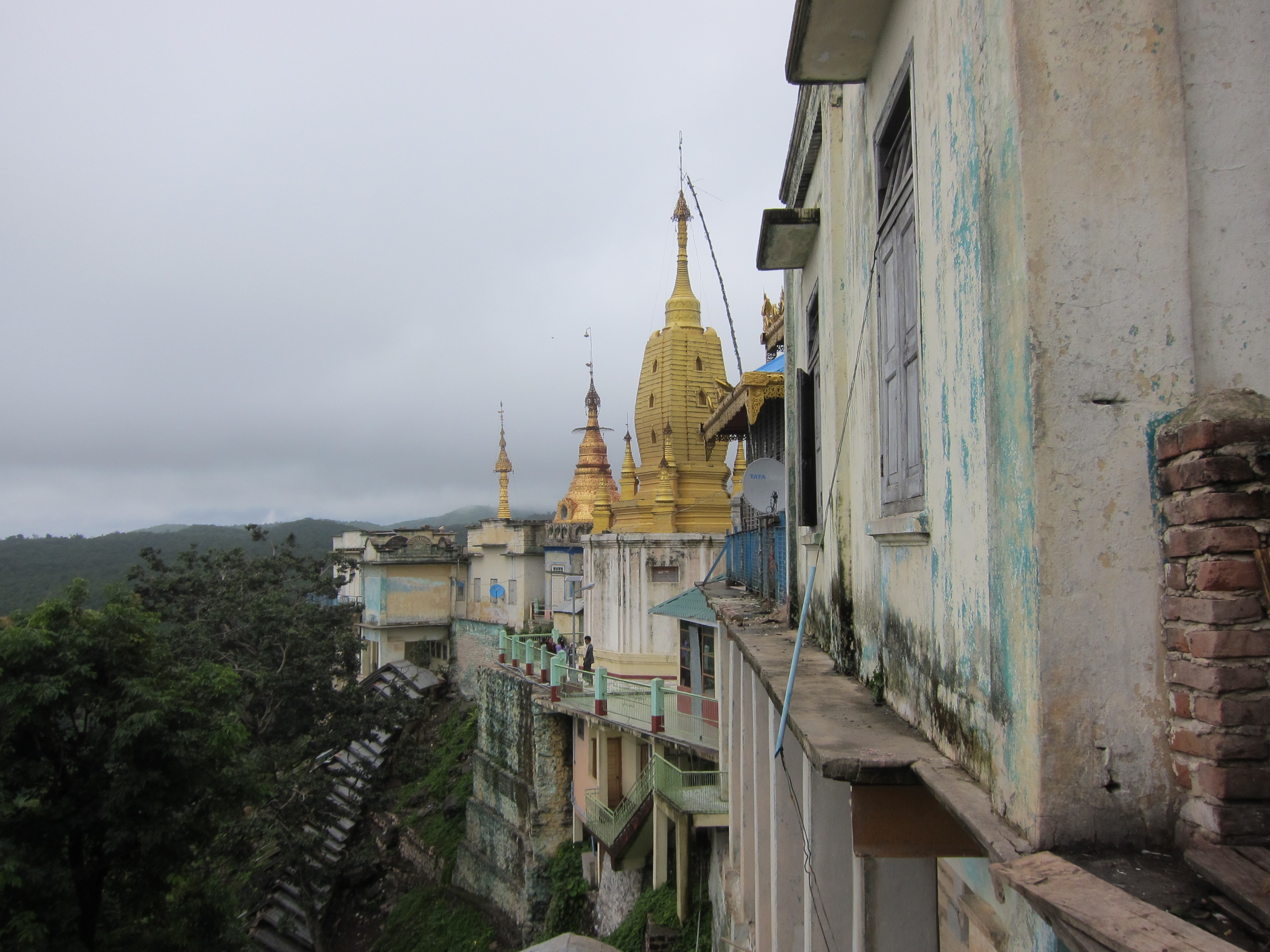 The next day we checked out and disembarked our cruise and bid goodbye to the staff. We booked a day tour with Orient Express and we were greeted by a local guide from Bagan who was much better and more honest than our Road to Mandalay Guide who was old and repetitive and did not give good information. We left the boat and checked in at the Aureum Palace Hotel in Bagan, which we learned is actually owned by a former member of the junta and very high ranking general….Oops! But we honestly did not know but we learned more and more about the current state of Burma during out trip. It was a very pretty resort but one could tell that it was indeed built by someone of power to show their power. After a quick check in we headed off on a bit of a drive to Mt. Popa, a volcano, and Taung Kalat, a volcanic rock formation (like a mini-table mountain) on the side of Mt. Popa. Along the way we stopped at a very local market, not a single other tourist in site, and a monastery where we got to visit the monk’s living quarters and saw how to wear a monk’s attire. At Truang Kalat we climbed the 777 steps up to the top, the steps were covered in Monkey poop and mud from the rain. Monkey seemed to be considered holy at this site. At the top was a recently built hodgepodge of temples and stupas. The most recent ones built this year, it is basically if I want to donate I can and have something built under my name. It was not worth the climb, but the climb itself was quite an experience.