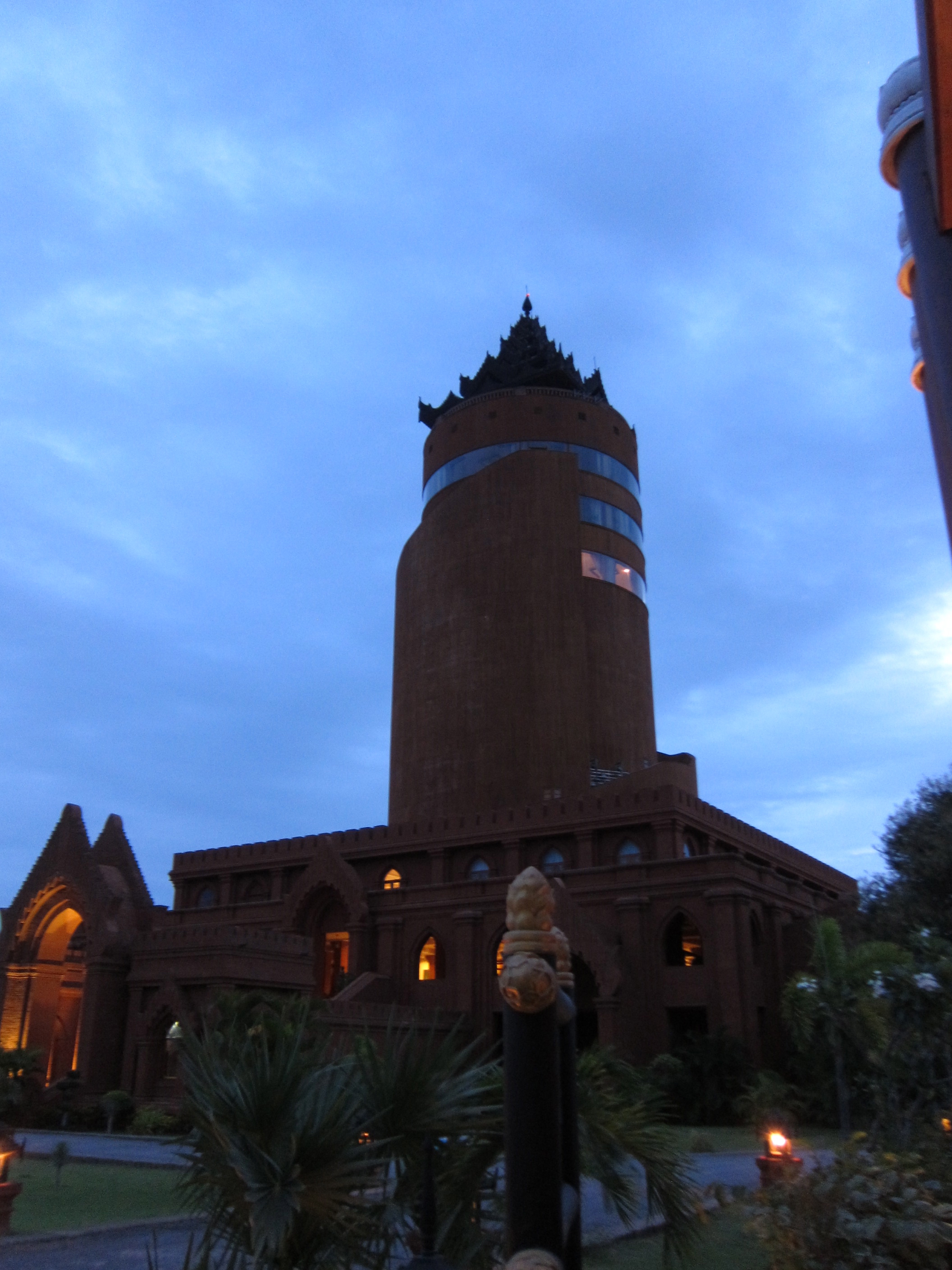 We then returned to our hotel and went up the Bagan Observation tower to view the sunset, which on this day was much better. It was obvious that the tower was simply built because the general could do it, it was tall and huge but very empty and ominous and ghostly. Then we had a lovely dinner in front of the pool with a view of Bagan.