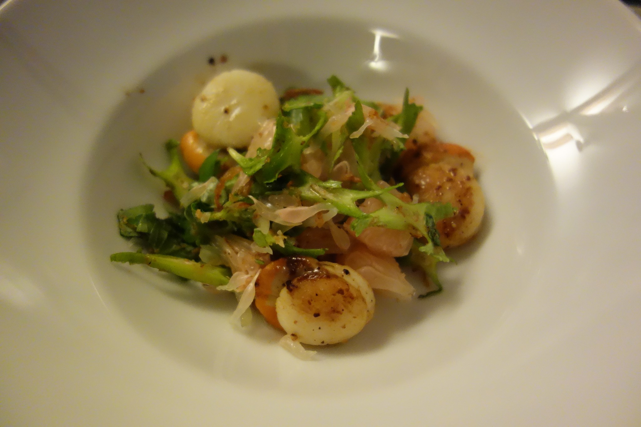 Seared scallops salad with pomelo, winged bean and lemon basil
