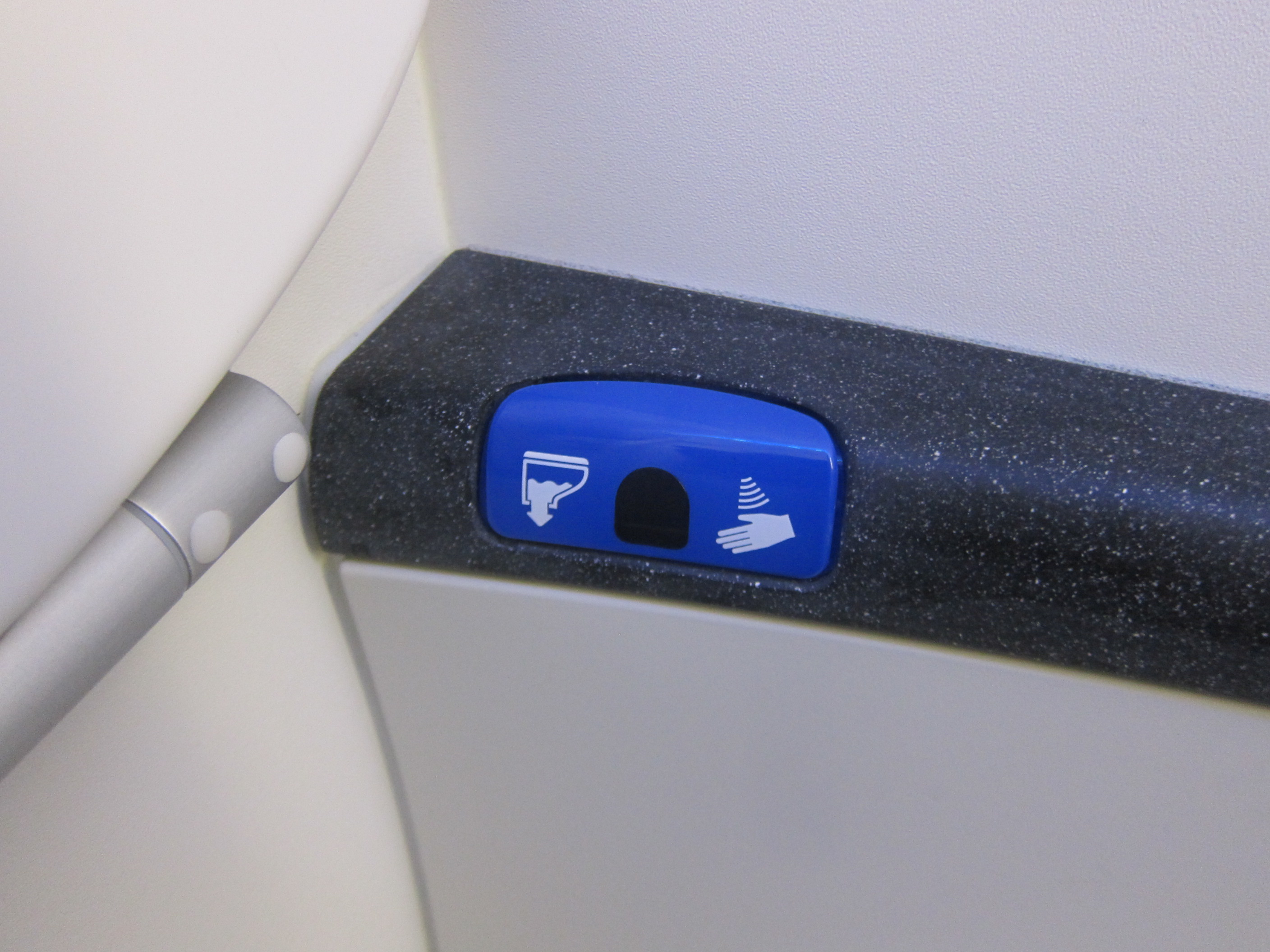 As per the usual domestic U.S. flight the flight was nothing special nor was the service. It was nice that the AVOD was running on such a short hop though, but for me I was most focused on looking out at the wings and looking around the plane. After the drink service I got up and headed for the bathroom. I was impressed to find that there was not flush button, but rather a sensor, thus alleviating that germ conscious frequent flyer from some of their anxieties. This really was a glimpse into the future of flight.