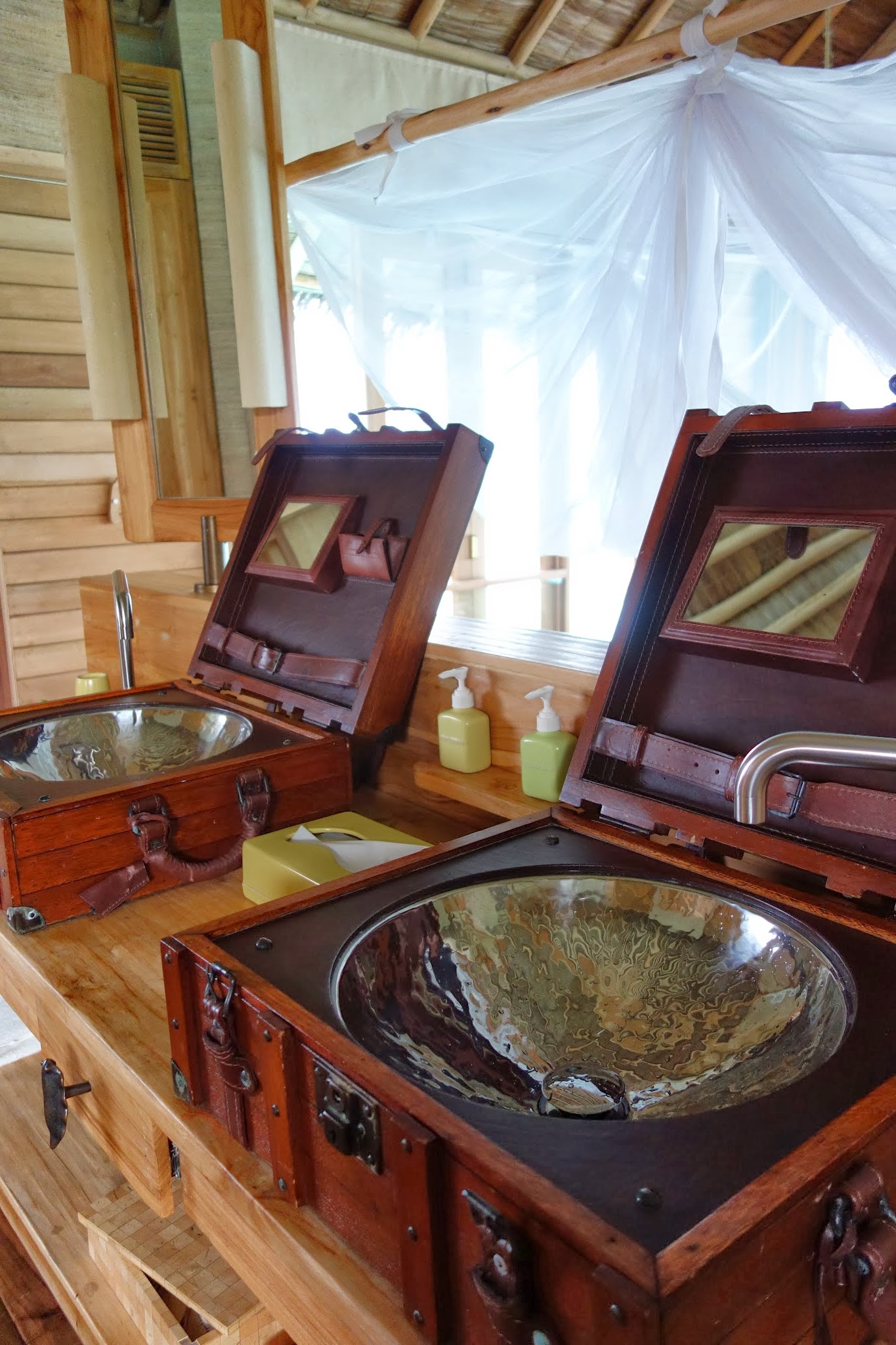 At the arrival jetty we were greeted by our GEM, Guest Experience Maker, as well as one of the directors of guest relations. The GEM is responsible for helping you plan your trip, getting your activities sorted and meeting your needs and expectations. Check in was done in the villa. We booked 3 nights in a Laamu Water Villa and 2 nights in an Ocean Beach Villa hoping to experience both types of rooms, but they then offered to extend our water villa stay at no extra costs and we went for it but still toured the beach villas and realized we made a good call, the overwater villas are the way to go and is a highlight of the Maldivian resort experience. We were at the end of Jetty B, and it turned out to be amazing. The rooms are very spacious, well designed and eco-friendly. The bathroom is outdoors and features a see-through fiberglass bathtub, which was really cool and also interesting to bathe in to say the least. The toilet is in a separate small room and features a glass panel to watch marine life. The sinks come in old-school leather suitcases. The deck features a sunken glass bottom dining area, lounge chairs, and hammocks. There is also a small rooftop balcony with a small couch. Each guest also gets a bicycle and with lammu villas, they get personalized wooden name plates. Climbing down the stairs from the bathroom or deck you enter the crystal clear turquoise waters of the lagoon, and right outside our two villas was a vibrant patch of coral teeming with life.