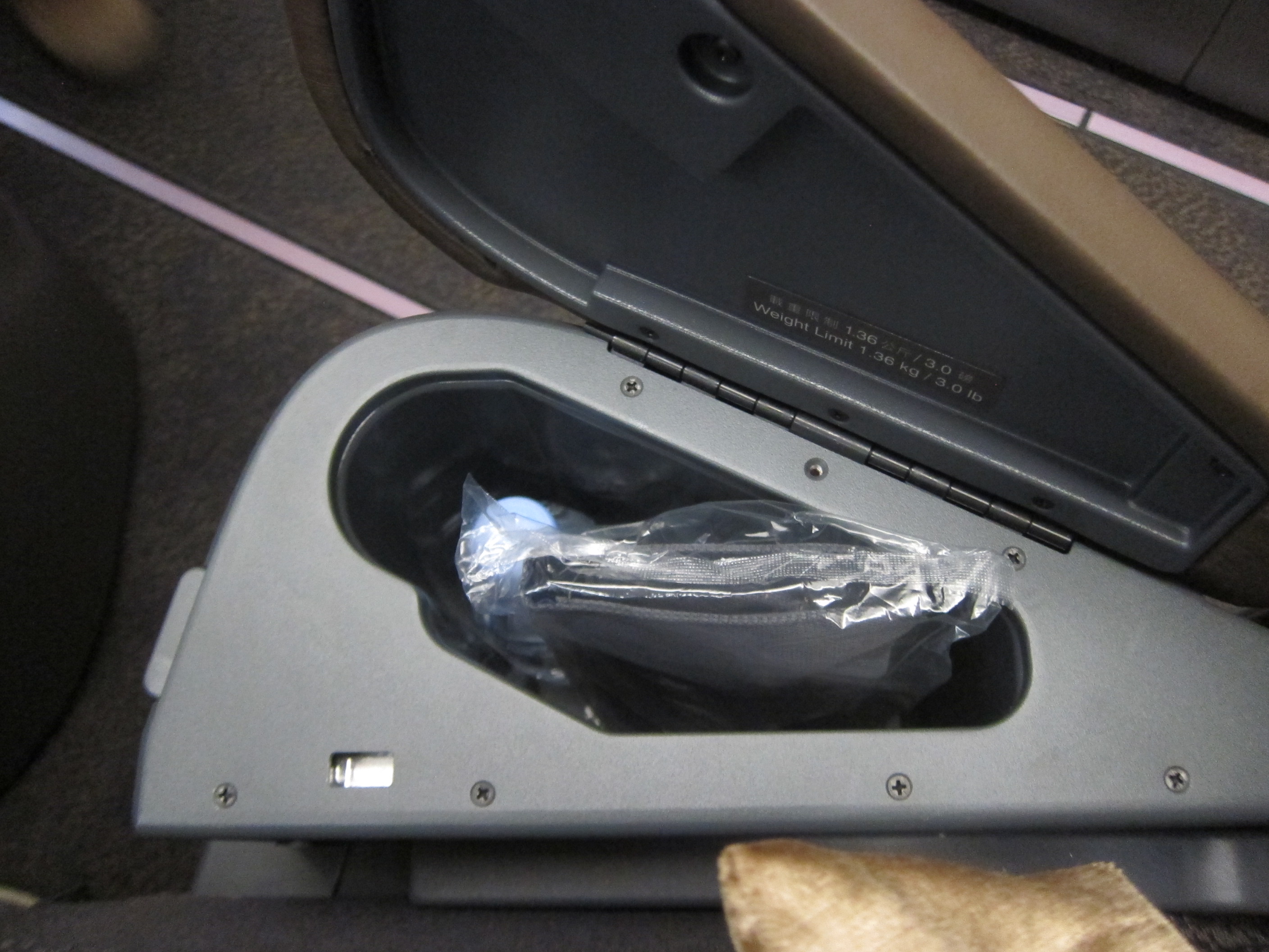 The retractable armrest, when opened it features a “mini bar,” though the crew use it to store your water bottle and amenity kit. It can be raised and lowered (which gives you more shoulder space when in sleep mode).