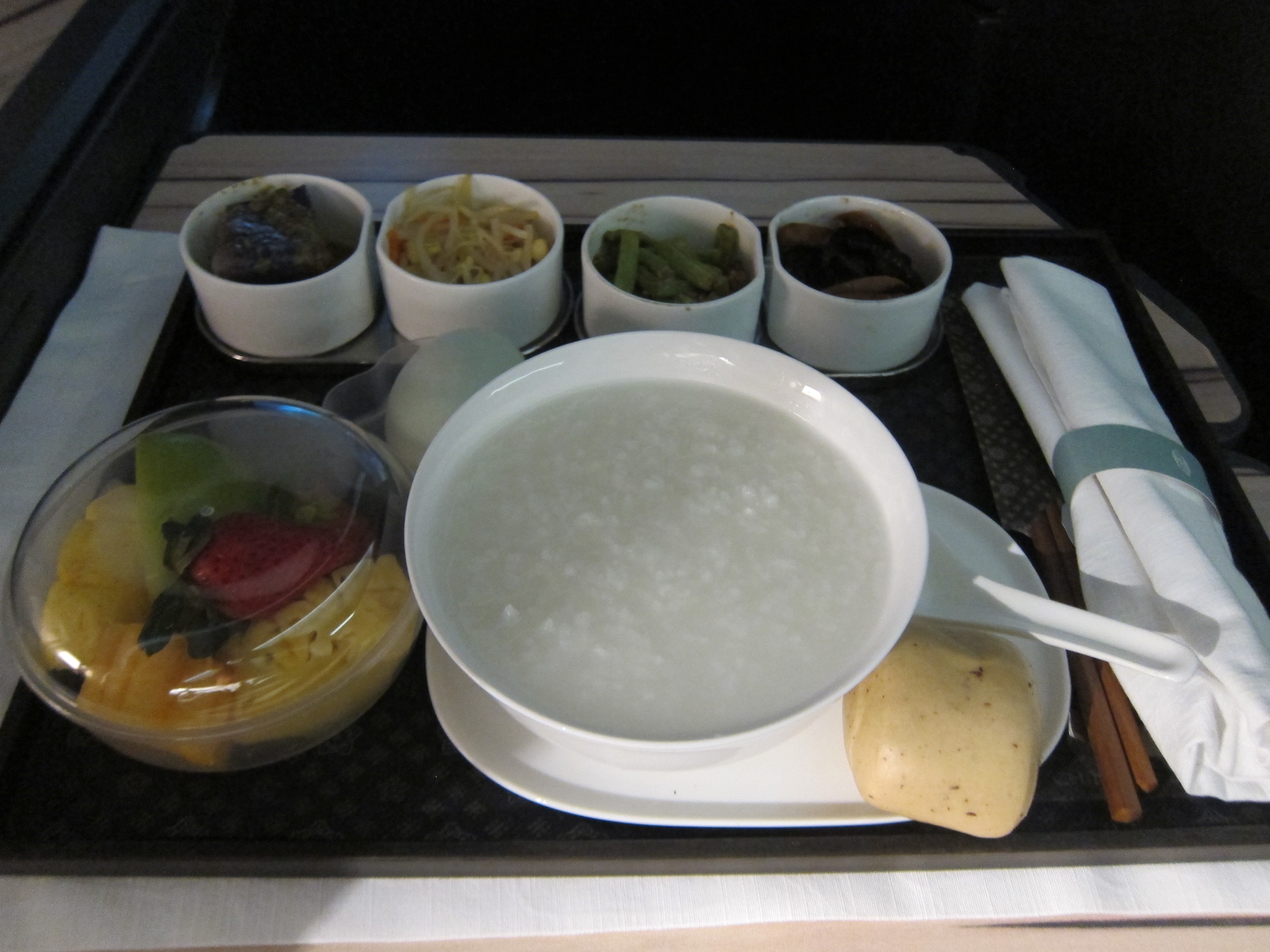 Breakfast served 2 hours prior to arrival: stir-fried bamboo shoot with mushroom, Stir-fried pork and green beans with soy sauce, Tofu and eggplant with garlic soy paste, Bean sprouts salad, salty fermented egg, plain congee, Steamed bun. Always my favorite meal onboard CI transpacific flights, especially when flying back to Taiwan.