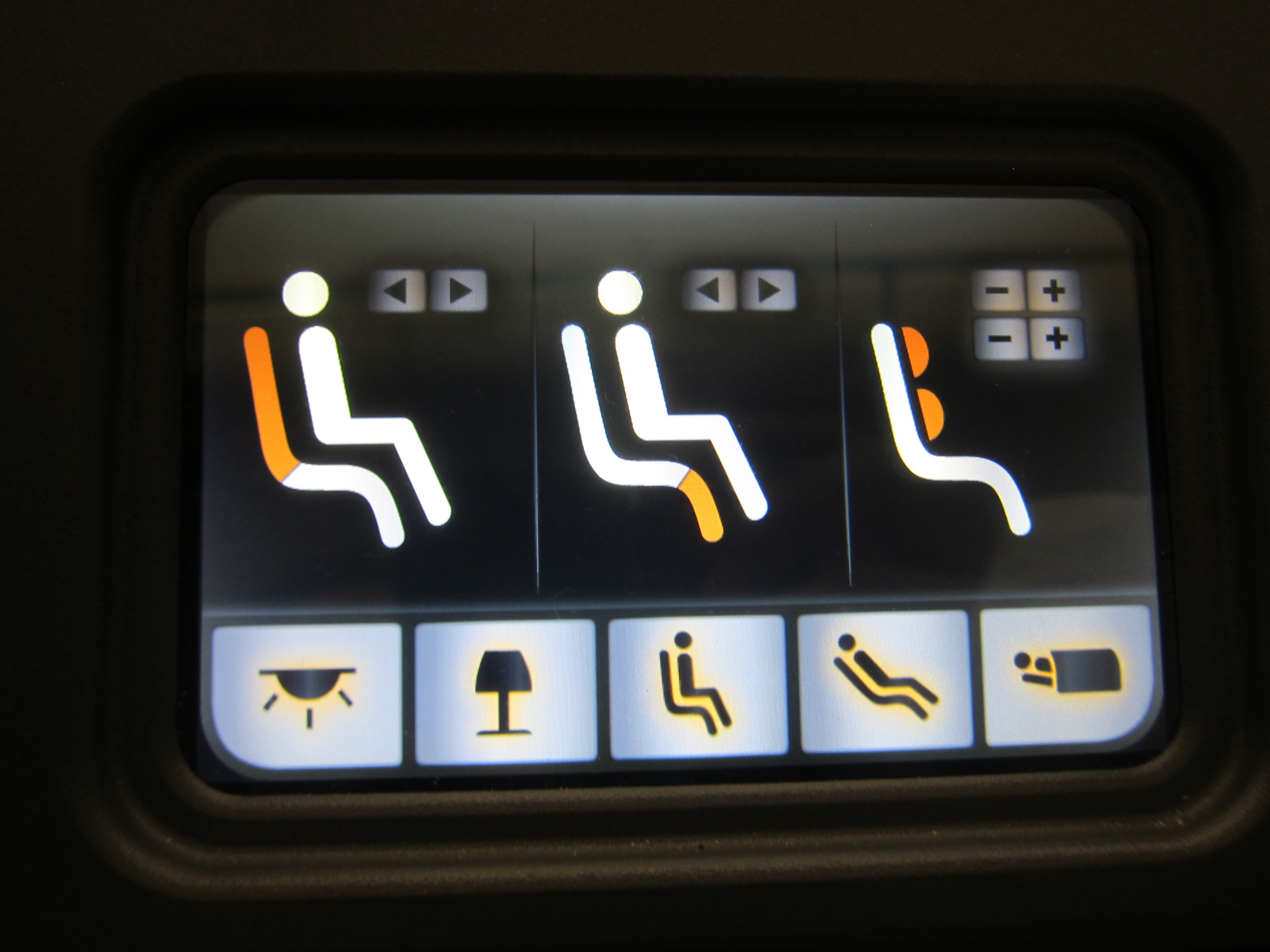 Seat 21A. with the 18″ personal touchscreen (one of the biggest in Business class), touchscreen AVOD controls, touchscreen seat controls, folded and stowed tray table and 1 out of 3 storage bins.
