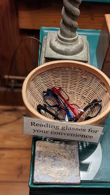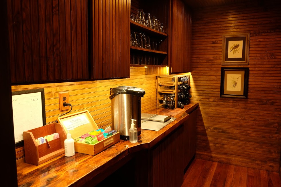 The common areas revolve around the main historic lodge. Here you have the living room with a wood-burning fireplace in the corner, library books, there are even reading glasses for your use should you need it. At one corner of the living room is also the bar, that is technically open 24/7, not really self-serve but at times it seemed that way. Posted on the bar-top is a list of guests for each night, their full names and where they hail from. I appreciated this touch as it helped me remember other guests’ names since during activities, happy hour and meal times you socialize (even with socially-distant seating and tabling). By the entrance is a table with masks in case you forgot or need a replacement, the daily menu as well as some brochures/information. Next to the living room is a “museum” but is now part of dining space, then there are two main dining rooms that in normal times would be for family style meals. There is small canteen area for tea and water. If you are hungry at all hours, there is a self-serve snack bar. Then there is the gift shop and office. The offie is where you handle your bill at the end, book picnic lunches, pay and register for fishing licenses, get your skiff equipment and keys, as well as the soda and beer fridge! There is also a bulletin with all pictures/names/hometowns of each team member including which sub-team they are on, this is also helpful to remember every person you meet. Other things they provide on the porch are ponchos and umbrellas in case of rain, insect and tick repellent and sunscreen. Though-out the property hand sanitizer is readily available as well as signs to remind you to stay masked indoors.